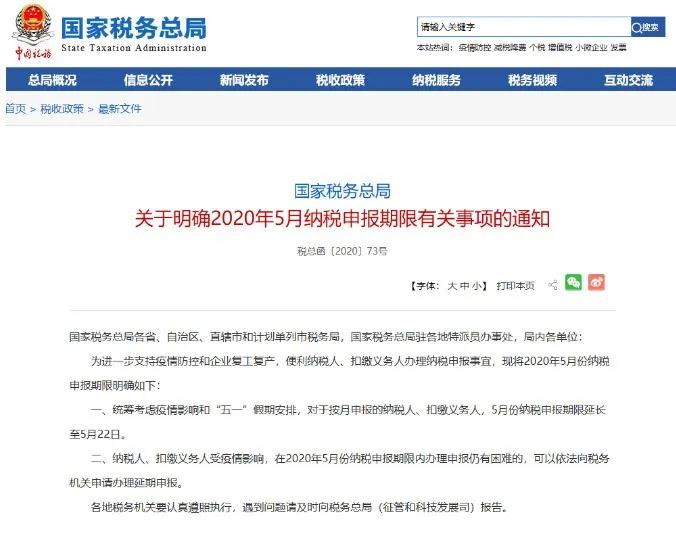 一、统筹考虑疫情影响和“五一”假期安排,对于按月申报的纳税人、扣缴义务人,5月份纳税申报期限延长至5月22日。