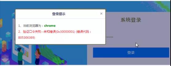 4、登陆综合平台提示:验证口令失败,未知错误(0x30000001)(错误代码:805306369)。但是开票软件登陆正常,口令正确。提示如下图: