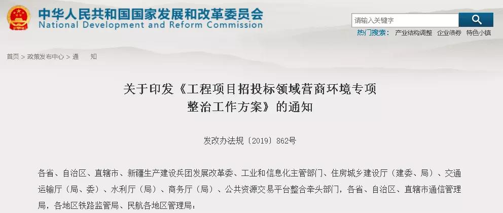 国家发改委、住建部、工信部、交通部、水利部等八部门联合下发通知,决定在全国开展工程项目招投标领域营商环境专项整治。本次专项整治自8月20日起开展,12月15日之前结束。