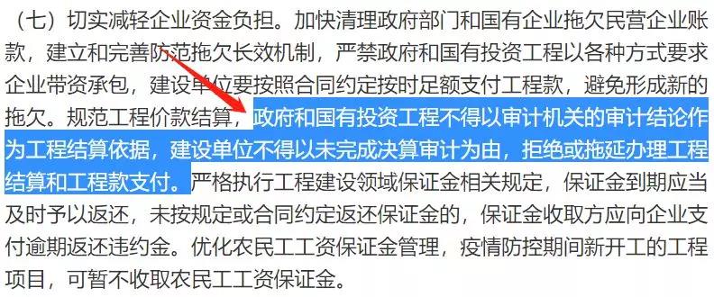 (七)切实减轻企业资金负担。加快清理政府部门和国有企业拖欠民营企业账款,建立和完善防范拖欠长效机制,严禁政府和国有投资工程以各种方式要求企业带资承包,建设单位要按照合同约定按时足额支付工程款,避免形成新的拖欠。规范工程价款结算,政府和国有投资工程不得以审计机关的审计结论作为工程结算依据,建设单位不得以未完成决算审计为由,拒绝或拖延办理工程结算和工程款支付。严格执行工程建设领域保证金相关规定,保证金到期应当及时予以返还,未按规定或合同约定返还保证金的,保证金收取方应向企业支付逾期返还违约金。优化农民工工资保证金管理,疫情防控期间新开工的工程项目,可暂不收取农民工工资保证金。