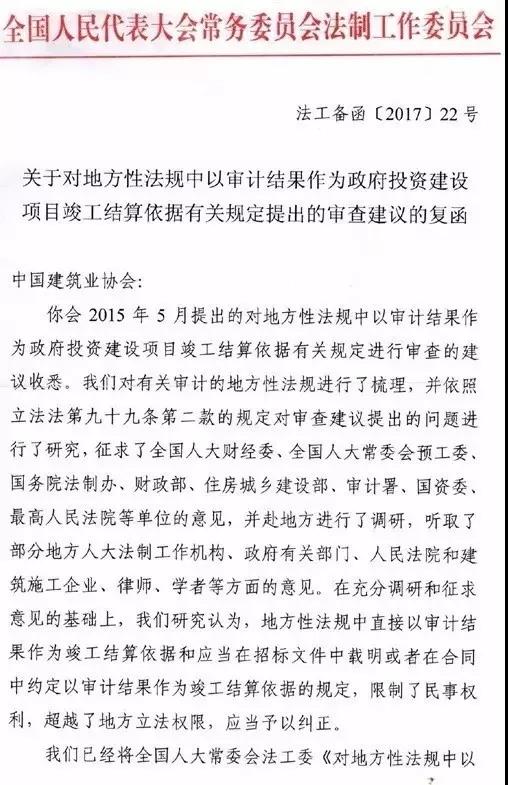 建筑行业内关注的“以审计结果作为建设工程竣工结算依据”问题,在2017年全国人大常委会法工委复函明确:应当予以纠正。