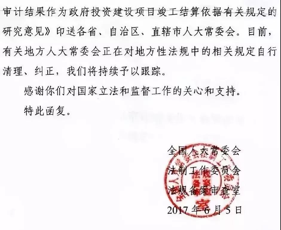 早在2017年全国人大常委会法工委复函《关于对地方性法规中以审计结果作为政府投资建设项目竣工结算依据有关规定提出的审查建议的复函》。该复函提出: