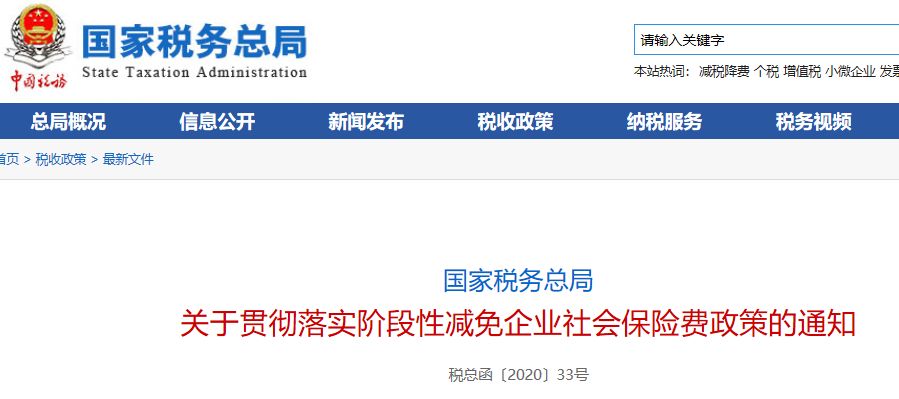 国家税务总局关于贯彻落实阶段性减免企业社会保险费政策的通知税总函〔2020〕33号 财务君划重点: