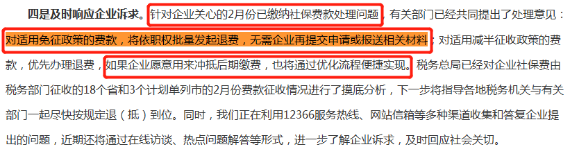 四是及时响应企业诉求。针对企业关心的2月份已缴纳社保费款处理问题,有关部门已经共同提出了处理意见:对适用免征政策的费款,将依职权批量发起退费,无需企业再提交申请或报送相关材料;对适用减半征收政策的费款,优先办理退费,如果企业愿意用来冲抵后期缴费,也将通过优化流程便捷实现。