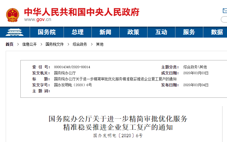 为贯彻落实党中央关于统筹推进疫情防控和经济社会发展工作的决策部署,深化“放管服”改革,取消不合理审批,规范审批事项和行为,提供便利服务,精准稳妥推进企业复工复产,现就除湖北省、北京市以外地区复工复产有关事项通知如下:
