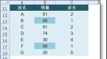 公式:C12=SUMPRODUCT(($D$4:$D$9>=D4)*(1/COUNTIF(D$4:D$9,D$4:D$9)))
