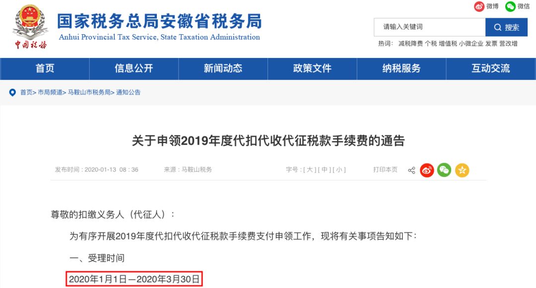 2.请代扣代缴单位于3月30日前完成上一年度手续费退付的申请。