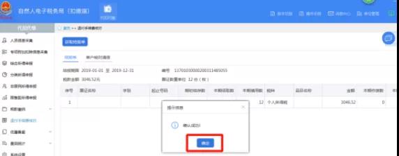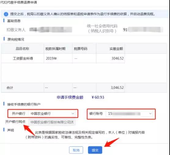 5.点击“我已核对无误”后系统弹出“代扣代缴手续费退费申请”,选择“开户银行”、“银行账号”,“开户银行网点”自动带出。阅读声明后,点击“提交”。提示信息“确认成功”弹框,点击“确定”。