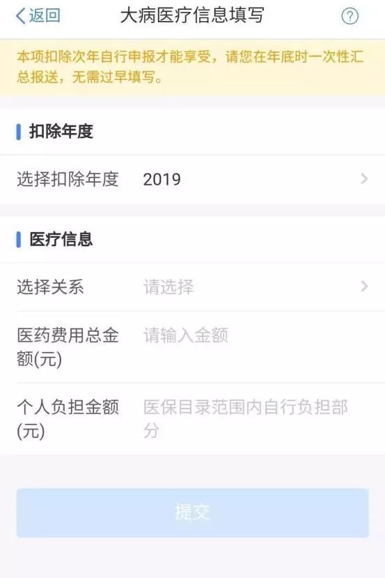 3. 填写大病医疗相关信息选择扣除年度;与纳税人的关系:可选择“本人”“配偶”“子女”;据实录入医疗费用总金额;据实填写扣除医保报销后个人负担金额(指医保目录范围内的自付部分)。完成填写后,点击【提交】。完成以上三步后,