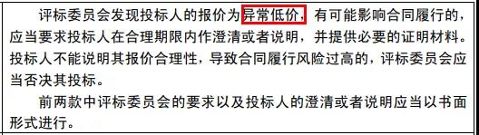 发现投标人的报价为异常低价,有可能影响合同履行的,应当要求投标人在合理期限内作澄清或者说明,并提供必要的证明材料。不能说明其报价合理性,导致合同履行风险过高的,应当否决其投标。
