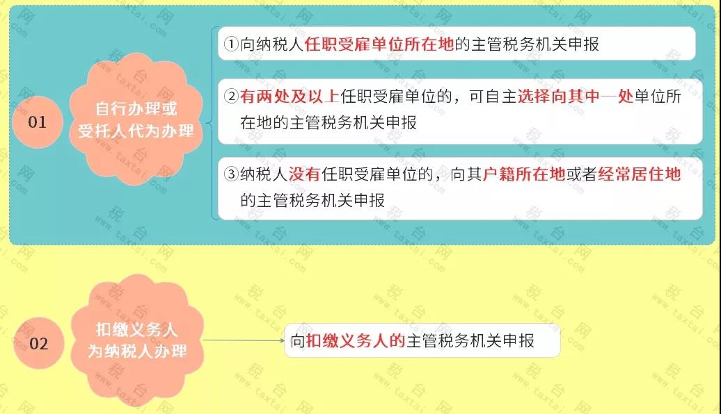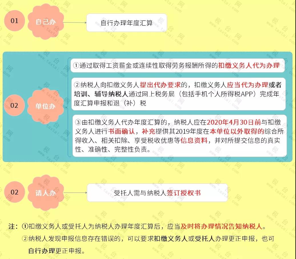 1、若纳税人需要所在单位代办2019年度的综合所得年度汇算,需在2020年4月30日前与单位进行书面确认;逾期未确认的,则需在2020年6月30日前自行办理年度汇算。