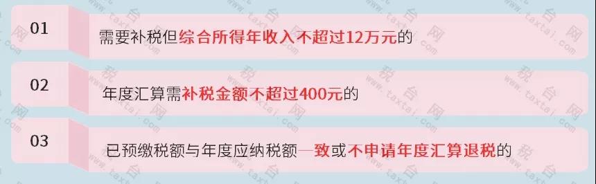 居民个人2019年度取得综合所得时扣缴义务人已依法预缴了个人所得税的,且符合以下条件之一的,可以不办理年度汇算: