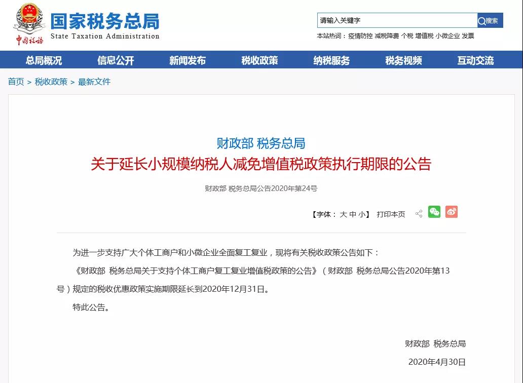刚刚,税务总局发布财政部税务总局公告2020年第24号,明确:延长小规模纳税人减免增值税政策执行期限!