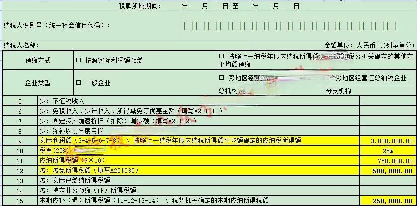 本行填报根据本期《中华人民共和国企业所得税月(季)度预缴纳税申报表(A类)》(A200000)第9行计算的减免企业所得税的本年累计金额。300万计算出来的减免企业所得税的金额就是50万。