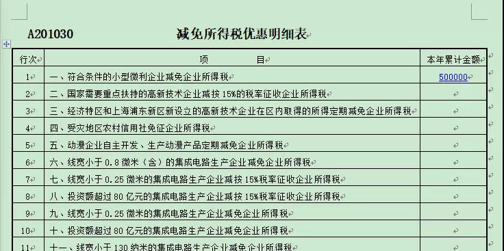《减免所得税优惠明细表》(A201030)第1行填报享受小型微利企业普惠性所得税减免政策减免企业所得税的金额。