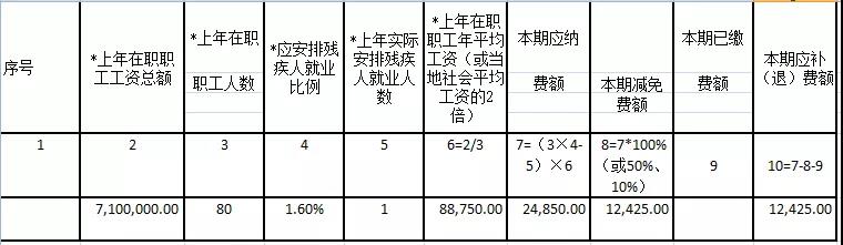 又比如:A公司2020年工资总额710万,职工人数80人,四川省要求的残疾人就业安排比例是1.6%,实际公司安排残疾人1人,安置比例小于1.6%,但是大于1%(实际是1.25%),那实际我们就只按照应纳费额的50%缴纳,相当于减免了50%的费用。
