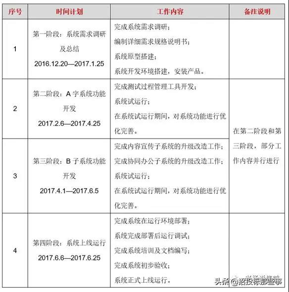 对于技术方案中的其它内容,诸如涉及到系统架构、功能架构、工作流程、项目组织架构、项目工期(甘特图、表格)、项目人员安排(简历表格、学历、学位证书、资质证书)等,除了基本的文字描述外,应尽可能通过图形化、表格化进行展示,这样看上去更直观,更便于阅读和理解。