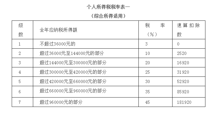 1.居民个人的综合所得,以每一纳税年度的收入额减除费用六万元以及专项扣除、专项附加扣除和依法确定的其他扣除后的余额,为应纳税所得额,适用百分之三至百分之四十五的超额累进税率(详见个人所得税税率表一);