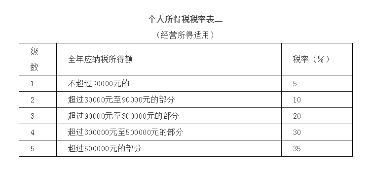 3.经营所得,以每一纳税年度的收入总额减除成本、费用以及损失后的余额,为应纳税所得额,适用百分之五至百分之三十五的超额累进税率。(详见个人所得税税率表二)