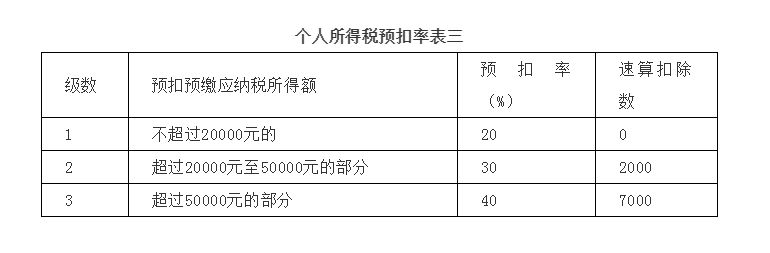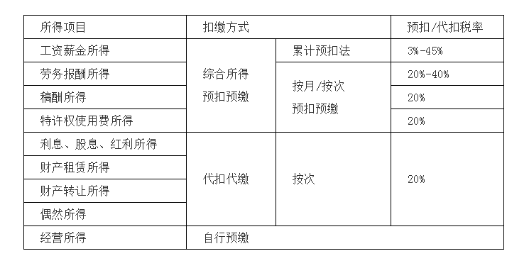 居民个人取得综合所得,按年计算个人所得税;有扣缴义务人的,由扣缴义务人按月或者按次预扣预缴税款(详见个人所得税预扣率表三)。