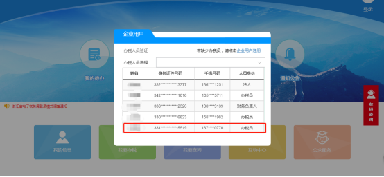 3、支付宝扫码完成实名认证采集,完成实名认证采集后,该办税人员信息在实名库已成功与该企业完成绑定,在重新登录时办税人员选择界面便能显示刚刚绑定的办税人员信息: