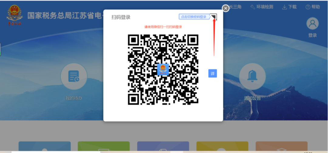 1、打开电子税务局后,在登录主界面点击“点击切换扫码登录”按钮。