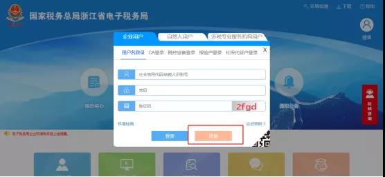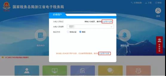 通过企业用户注册绑定企业办税人员:1.若发现下拉框中未出现需要选择的办税员信息需要新增办税员,或者选择密码验证时提示未注册需要注册账号,请点击登录框中“企业用户注册”,进入用户注册及企业绑定界面,如下图所示: