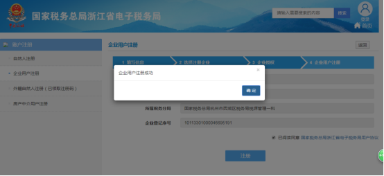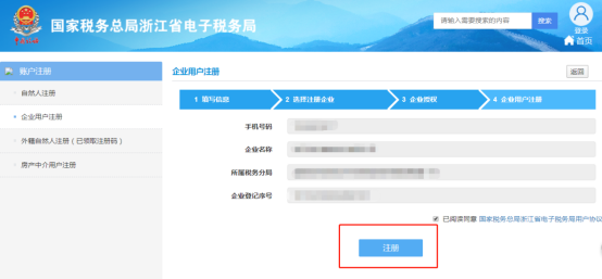 5.授权成功后,进入企业用户注册界面,再次确认企业信息,点击“注册”按钮,如下图所示: