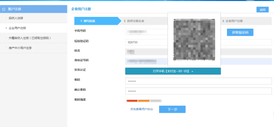 2.未注册的自然人用户,录入必填项,通过支付宝扫码完成实名认证,设置登录密码,如下图所示:
