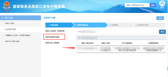 3.点击“下一步”,进入注册企业选择界面,录入纳税人识别号后点击“搜索”,“选择企业登记信息”栏会显示系统中该税号的登记信息,请点击选择需要绑定的企业信息。如下图所示: