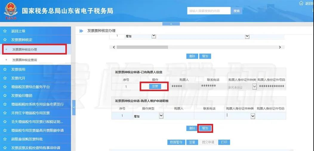 依次顺序点击“我要办税”→“发票使用”→左侧菜单“发票票种核定”→“发票票种核定办理”,如要变更购票人,请点击【变更】变更相应项;如要增加购票人,请点击【增加】。