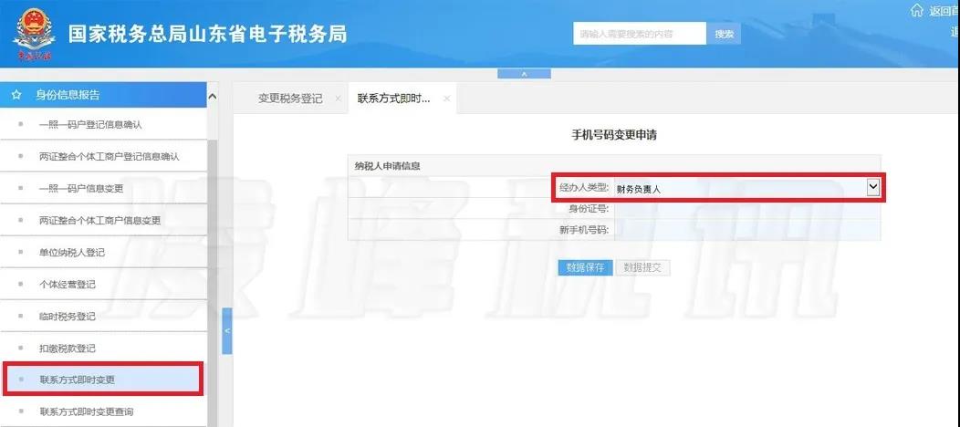 如果仅是变更系统内已登记的法人、财务负责人、办税人联系方式,可以点击左侧菜单“身份信息报告”→“联系方式即时变更”,选择相应人员进行手机号码变更。