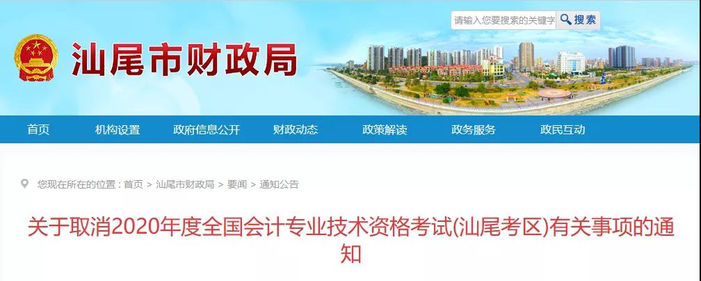 根据财政部《关于调整2020年度全国会计专业技术资格考试考务日程安排及有关事项的通知》 (会考〔2020〕5号)和《广东省财政厅关于调整2020年度全国会计专业技术资格考试考务日程安排及有关事项的通知》(粤财会〔2020〕17号)文件精神,汕尾因受突发疫情的影响,经征求汕尾市新型冠状病毒感染的肺炎疫情防控指挥部意见,为保障广大考生和考务工作人员的生命安全和身体健康,决定取消2020年度全国会计专业技术资格无纸化考试(汕尾考区)的全部考试项目。