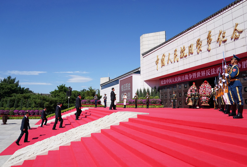 9时57分,习近平、李克强、栗战书、汪洋、王沪宁、赵乐际、韩正、王岐山等来到这里。习近平等在中国人民抗日战争纪念馆前的平台上肃立。参加过抗日战争的老战士和抗战将领亲属代表、抗战烈士遗属代表,为中国人民抗日战争胜利作出贡献的国际友人遗属代表,解放军和武警部队官兵代表,首都各界群众代表,面向纪念馆肃立。