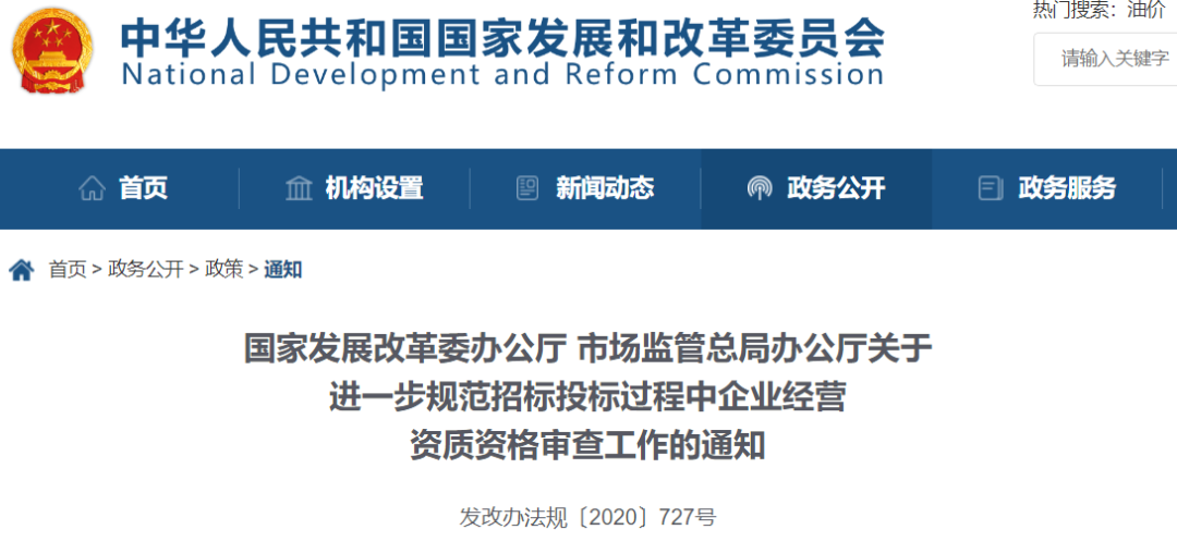 国家发改委和市监总局发布《关于进一步规范招标投标过程中企业经营资质资格审查工作的通知》。
