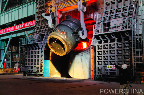 ▲朝阳钢铁炼钢厂转炉兑铁作业