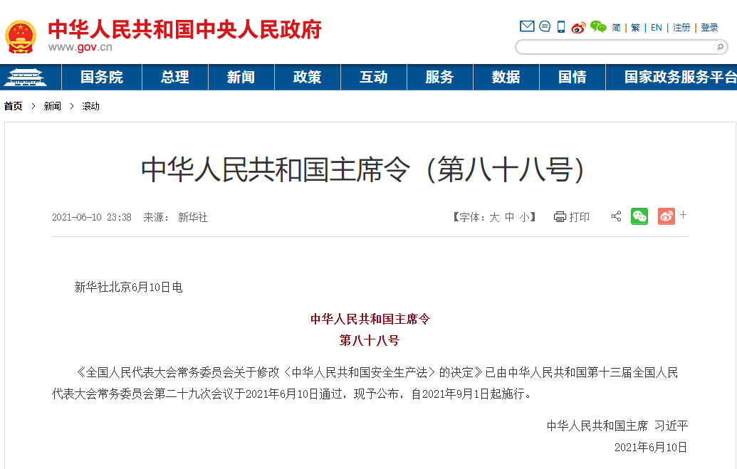 第八十八号主席令说,《全国人民代表大会常务委员会关于修改〈中华人民共和国安全生产法〉的决定》已由中华人民共和国第十三届全国人民代表大会常务委员会第二十九次会议于2021年6月10日通过,现予公布,自2021年9月1日起施行。
