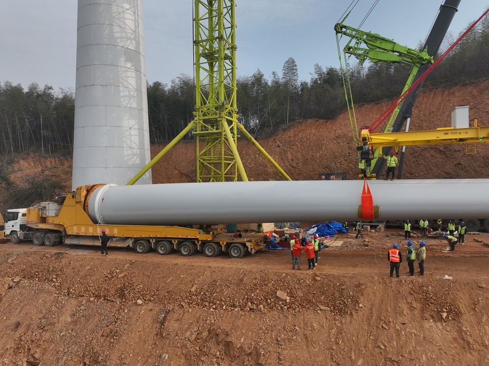 风机吊装是项目核心难点,单台风机轮毂中心高度达150米,叶片长度105米,且山区风力多变、能见度不稳定,对吊装精度与安全控制提出极高要求。为确保首吊成功,项目团队成立专项攻坚小组,多次组织论证吊装方案,优化起重机站位与吊装顺序;全体施工人员实行昼夜作业模式,白天抢运设备、调试机械,夜间攻克技术难题、排查安全隐患,最终精准完成风机机舱、轮毂及叶片的吊装对接,全程零安全事故。