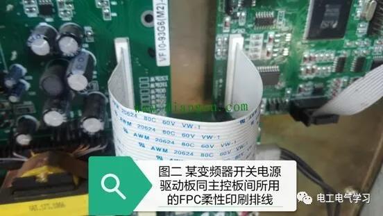 图二所示为某型变频器内部使用的另一种排线形式——FPC柔性印刷排线。这种形式的排线质地柔软,可以在相当程度上避免图一形式排线耐折性较差的弊端。但这种形式的排线也具有一个非常明显的缺点,即插接安装时要格外小心,务必确保排线能插接到位和平整。话说一位同行在检修完某变频器开关电源驱动板后(开关电源部分故障),将线路复位并插好含有FPC柔性印刷排线在内的各导线,可试机过程中却发现变频器操作执行动作虽正常。可变频器仅有频率变化而无输出电压的奇特故障现象!在经过近一个小时的反复检测后,最终的故障原因却非常让人意外——由于在插接开关电源驱动电路板同主控板间的FPC柔性印刷排线时,该同行不够细心致使排线一端发生了一定角度的倾斜,结果导致主控板发送到驱动部分开启六路PWM驱动光耦的总开启信号未能送达,继而造成上述故障现象发生!