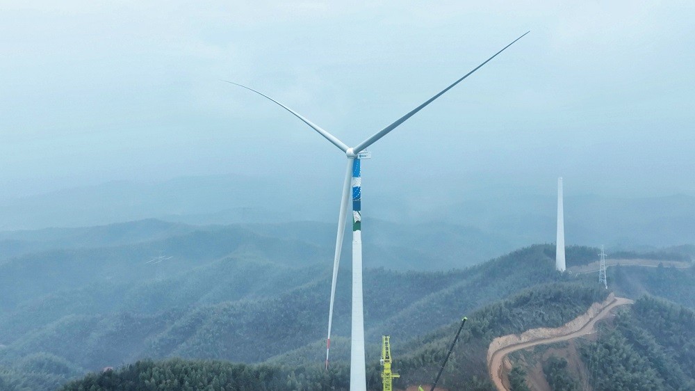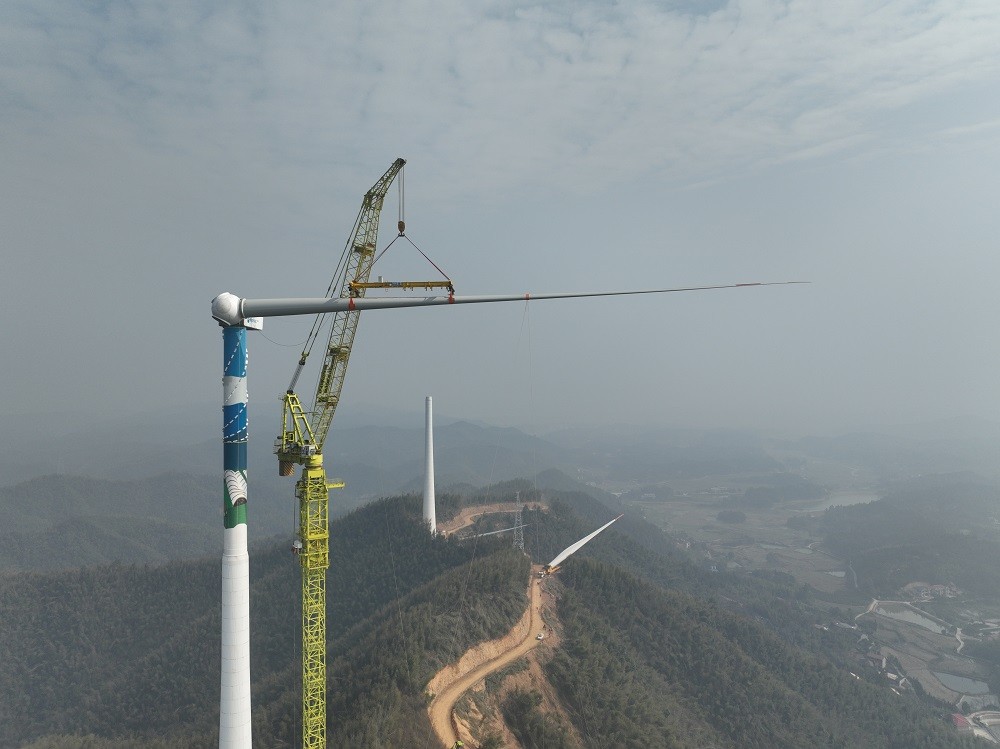 近日,随着最后一段风机叶片精准对接轮毂,集团公司承建的湖南衡山风电项目首台风机吊装作业顺利完成,标志着项目建设迈入核心工程攻坚阶段,为后续并网发电奠定坚实基础。